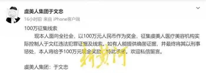 在美丽的外表背后,虞美人集团正在上演一场家族恩怨的戏码。2024年2月17日晚,虞美人医疗美容机构实际控制人于文红的胞弟于文忠,通过新浪微博发布实名悬赏,以百万巨款征集姐姐于文红的违法犯罪证据。其在微博中称:“现本人面向全社会,以100万元人民币作为奖金,征集虞美人医疗美容机构实际控制人于文红违法犯罪证据及线索。如有人能提供确凿证据,并最终将其以刑事惩处,本人将给予100万元现金奖励,特此承诺。欢迎私信留言。”