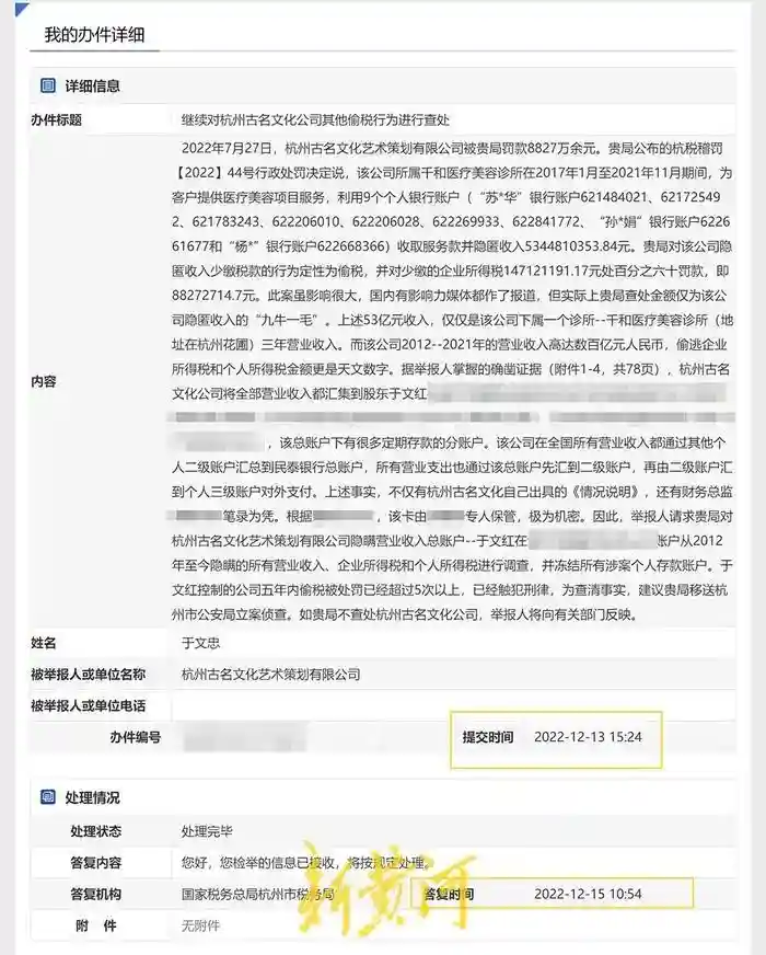 在与姐姐决裂后,2022年12月13日,于文忠通过线上方式向国家税务总局杭州市税务局实名检举,称于文红在2012年就已经开始隐瞒营业收入,并要求稽查人员对杭州古名文化公司其他偷税行为进行查处。同年12月15日,国家税务总局杭州市税务局对于文忠的检举处理情况显示已经“处理完毕”,“这么大的案子,2天就处理完毕了?也没人告诉我是怎么处理的。”2023年2月,他又拿着检举材料及相关证据前往杭州市税务局稽查局举报中心,当面检举于文红及其实控企业偷漏税,“工作人员说核实困难,所以始终也没给我一个明确的答复。”