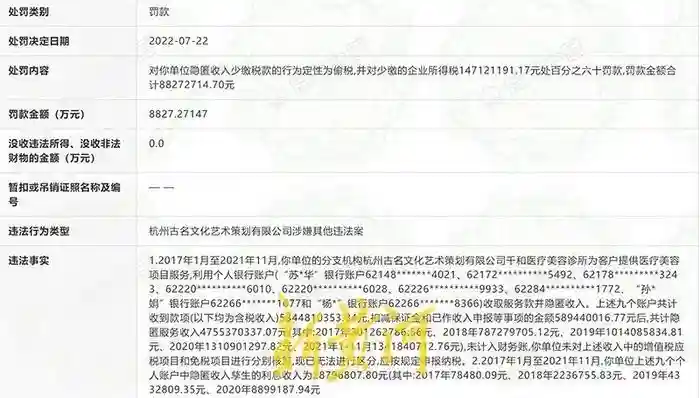 据信用中国显示,杭州古名文化公司分支机构千和医疗美容诊所利用9个个人银行账户收取服务款,9个账户共收到款项53亿余元,扣减保证金和已作收入申报等事项的金额5.8亿余元,共计隐匿收入超47.55亿元。其中,2017年3.01亿元、2018年7.88亿元、2019年10.14亿元、2020年13.11亿元、2021年1-11月13.42亿元,均未计入财务账,且并未对上述收入中的增值税应税项目和免税项目进行分别核算,现已无法进行区分,应按规定申报纳税。在此期间,该公司通过账户中隐匿收入孳生的利息收入约为2879.68万元。杭州市税务局对该公司隐匿收入少缴税款的行为定性为偷税。