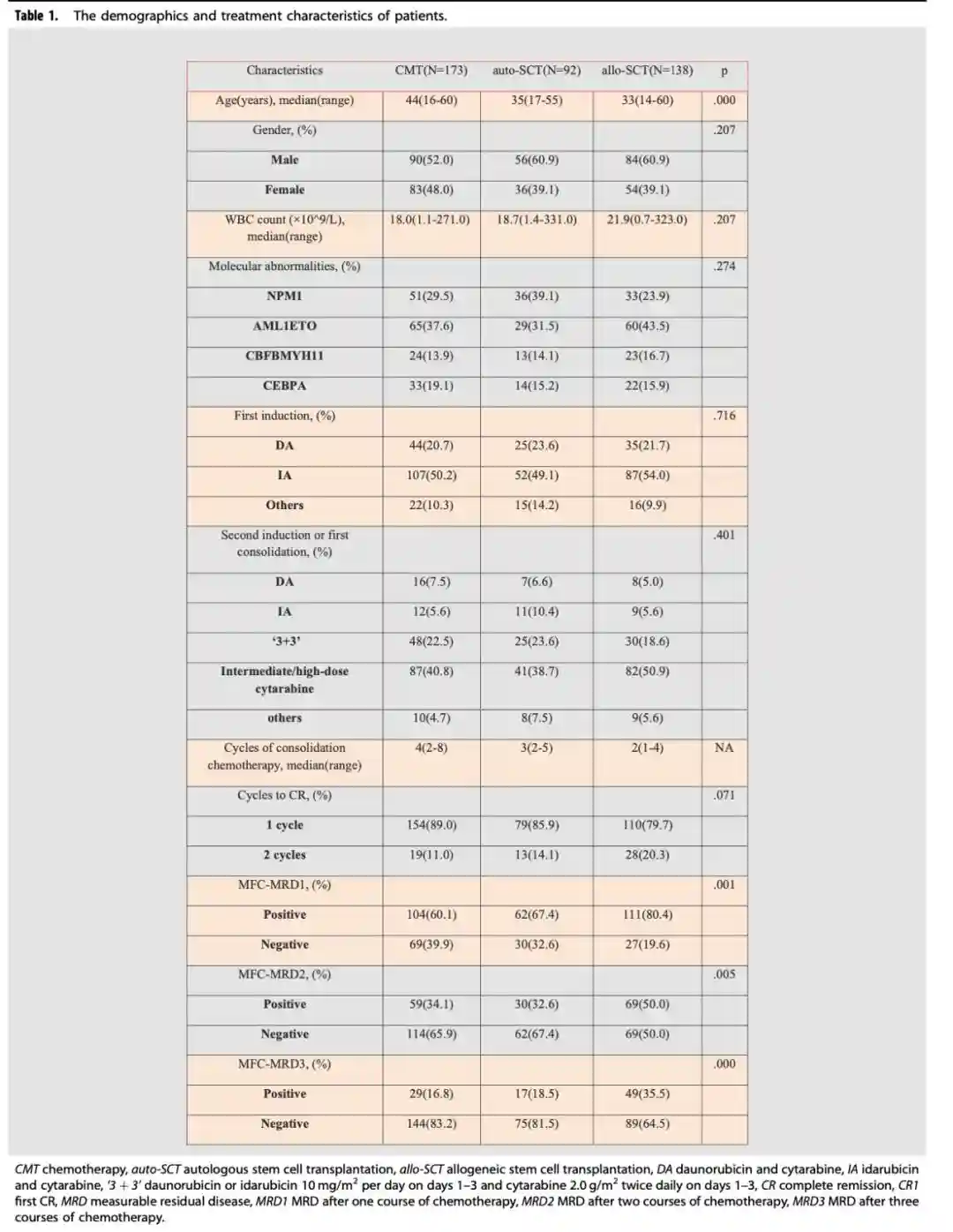 该研究共纳入403例患者,CMT组173例,auto-HSCT组92例,allo-HSCT组138例。该研究中,MRD是原因变量,因此为确保MRD数据完整性,排除了在3个化疗疗程内77例MRD数据缺失的患者。在这77例患者中,CMT组40例(18.8%),auto-HSCT组14例(13.2%)以及allo-HSCT组23例(14.3%)(p=0.335),数据缺失率在三组之间无统计学差异。在allo-HSCT组,61例患者接受了匹配同胞供者(MSD)移植,77例接受了替代供者移植,在后者中,64例为单倍体供者(HID)移植,10例为匹配无关供者(MUD)移植以及3例为脐带血移植。入组患者的中位年龄为36(14-60)岁,CMT组中位年龄为44(16-60)岁,auto-HSCT组为35(17-55)岁,allo-HSCT组33(14-60)岁。CMT组患者的年龄高于auto-HSCT和allo-HSCT组的患者,有统计学意义(p值分别为p=0.002和)。与CMT组相比,在allo-HSCT组中,需要两个周期才能达到CR的患者比例更高(p=0.026)。在allo-HSCT组中,第一次化疗后MRD+(MRD1+)、第二次化疗后MRD+(MRD2+)以及第三次化疗后MRD+(MRD3+)的患者更多(p=0.001、p=0.006、)。三组患者基本特征具体如图1。