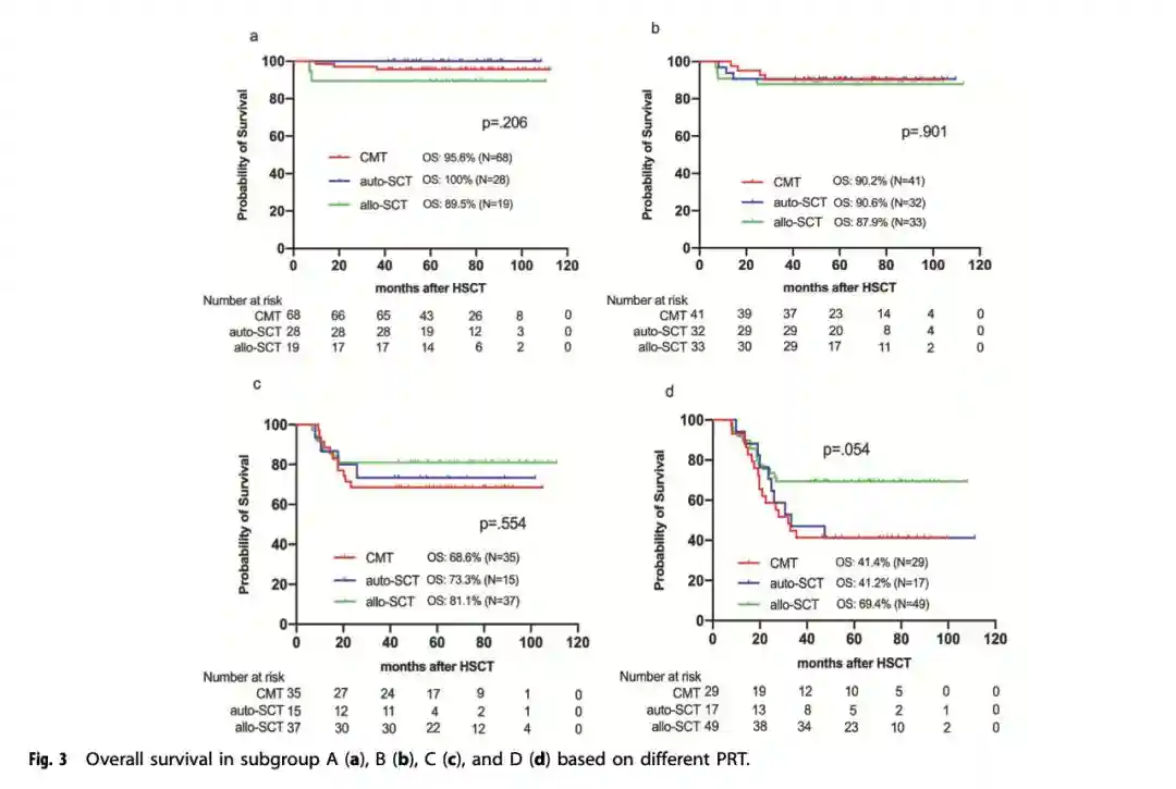研究者为了探索通过多参数流式细胞仪(MFC)动态监测的MRD、缓解后治疗方案选择和低危AML临床结局之间的关联,根据MRD1、MRD2和MRD3的动态变化进行了亚组分析。患者分为四个亚组:(I)亚组A,1个疗程化疗后达到MRD-(MRD1-/MRD2-/MRD3-);(II)亚组B,2个疗程化疗后达到MRD-(MRD1+/MRD2-/MRD3−);(III)亚组C,3个疗程化疗后达到MRD-(MRD1+/MRD2+/MRD3−);(IV)亚组D,3疗程化疗后持续MRD+(MRD1+/MRD2+/MRD3+)或MRD复阳(从MRD-到MRD+)。在亚组A和亚组B中,CMT组、auto-HSCT组和allo-HSCT组患者的OS无统计学差异(p值分别为p=0.340和p=0.627)。但在两个亚组中,CMT和auto-HSCT组患者的GRFS均优于allo-HSCT。在亚组C中,allo-HSCT组的DFS率优于CMT组(p=0.009)。在亚组A、B、C中,缓解后治疗方案的选择对OS并未有显著影响。但在亚组D中,allo-HSCT组的OS优于CMT组和auto-HSCT组(p值分别为p=0.011和p=0.029)。具体如图3。