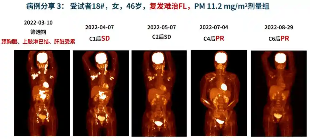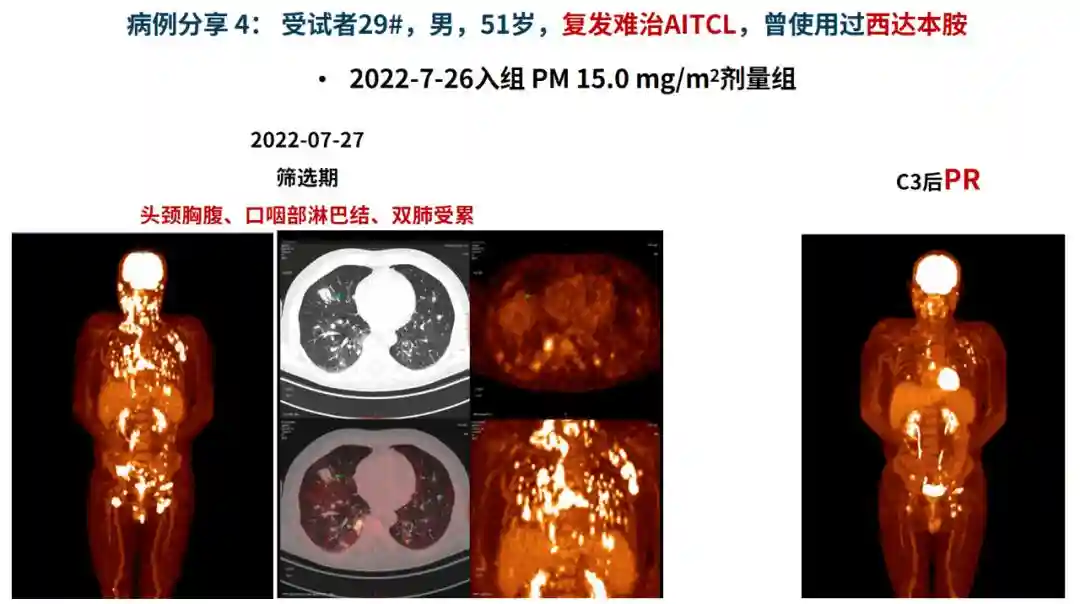 在18例淋巴瘤患者中,值得注意的是:1例复发DLBCL患者(/m2剂量组)在筛选期胸骨前方包块大小为5cm×5cm,在C1后胸骨前方包块已不能扪及,达到PR,在C3后达到CR(图1);1例前期经过二线治疗(西达本胺+R-CHOP,R-ICE)的难治DLBCL患者(/m2剂量组)在C1后达到微小缓解(MR),在C3后达到PR,在C5后达到CR(图2);1例R/R滤泡性淋巴瘤(FL)患者(/m2剂量组)筛选期颈胸腹、上肢淋巴结、肝脏受累,在C1、C2后疾病稳定(SD),在C4、C6后达到PR(图3);1例曾使用过西达本胺的血管免疫母细胞性T细胞淋巴瘤(AITL)患者(/m2剂量组)筛选期头颈胸腹、口咽部淋巴结、双肺受累,在C3后达到PR(图4)。