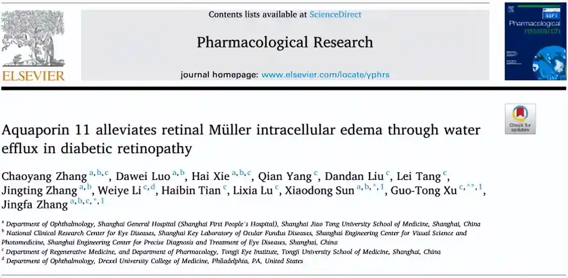 糖尿病视网膜病变(diabeticretinopathy,DR)是全球性工作人群致盲的主要眼病之一。其中,糖尿病黄斑水肿(Diabeticmacularedema,DME)可出现在DR的任意阶段,且DME是目前影响糖尿病患者视力的最主要原因。作为DME治疗的金标准,抗VEGF药物对大部分患者有效,但仍有部分患者反应欠佳,提示除VEGF外,其他发病因素也参与了DME的形成。上海市第一人民医院眼科张敬法教授、孙晓东教授团队联合同济大学医学院徐国彤教授团队,近期对水通道蛋白11(Aquaporin11,AQP11)在视网膜和Müller细胞中的功能作用进行了探索并取得了成果,该研究以“Aquaporin11alleviatesretinalMüllerintracellularedemathroughwatereffluxindiabeticretinopathy”为题,发表在药学专业期刊PharmacologicalResearch上(IF=10.334)。