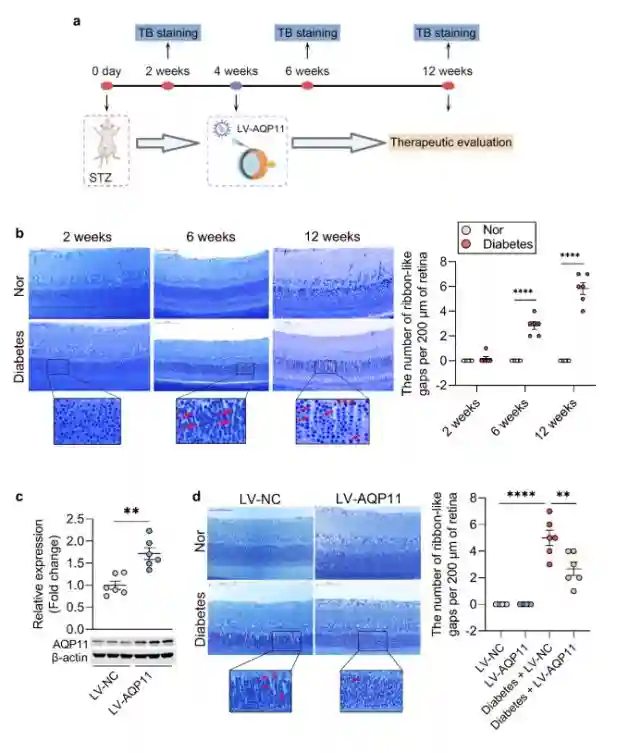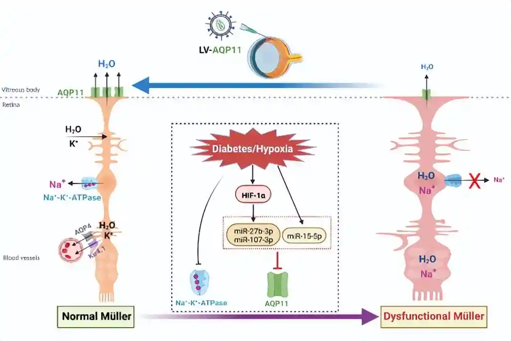 张教授及其团队研究发现,AQP11下调是导致糖尿病大鼠视网膜Müller细胞水肿的原因之一;而过表达AQP11增强了Müller细胞的外排水功能,进而减轻了Müller细胞性水肿和视网膜水肿。