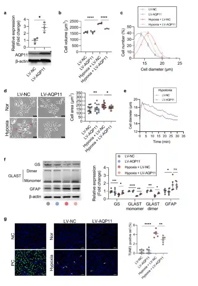 在低氧诱导的rMC-1细胞水肿模型中,过表达AQP11可有效减轻其水肿;同时,Müller的谷氨酸代谢功能明显改善、细胞凋亡显著减少;