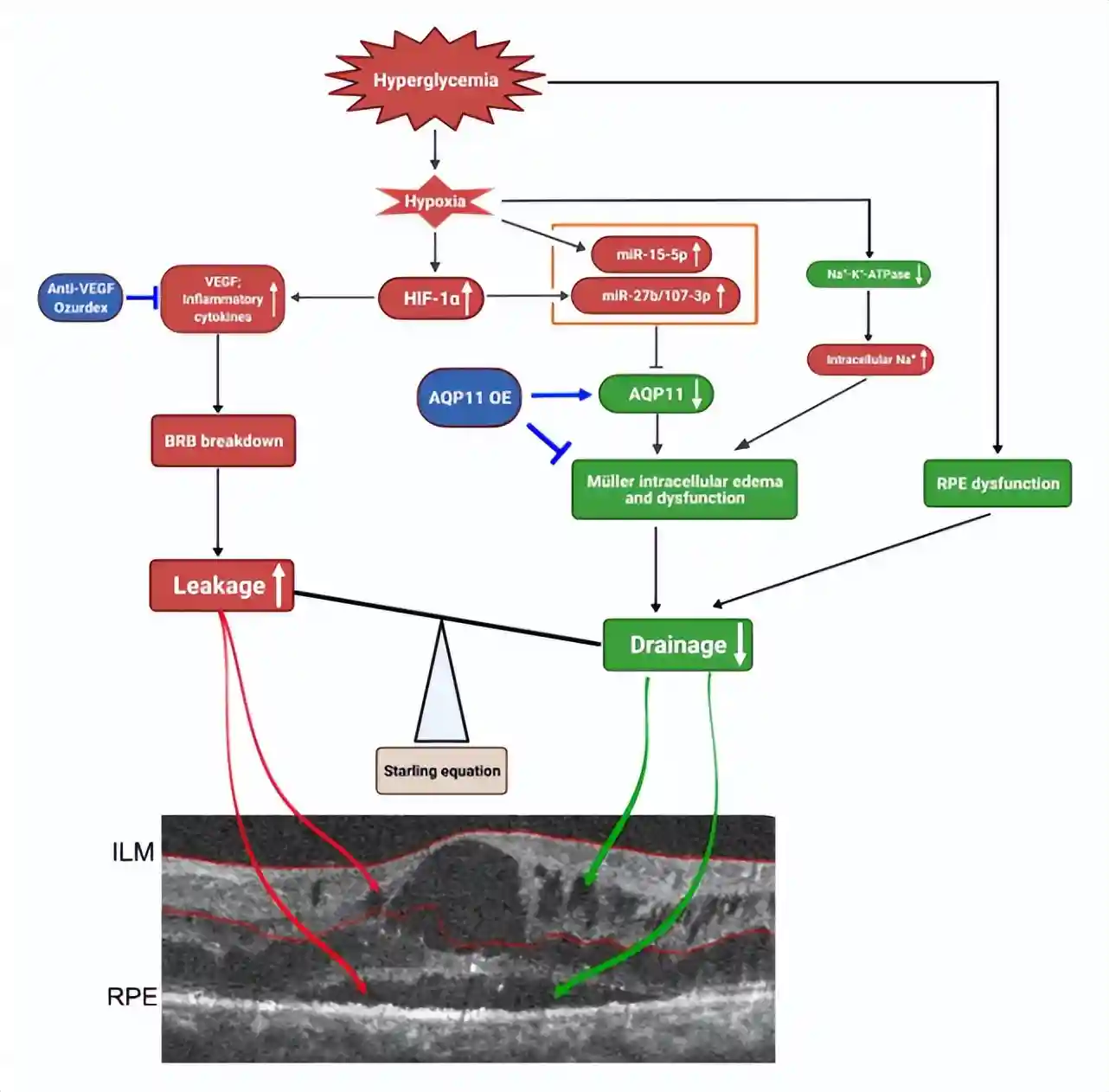 本研究结果提示:糖尿病视网膜中HIF-1α依赖/非依赖的miRNAs信号通路激活靶向抑制了Müller细胞AQP11的表达,进而引起Müller细胞排水功能障碍,最终导致Müller细胞性水肿;Müller细胞水肿及其功能异常可通过过表达AQP11得以显著改善。张教授及其团队的研究为DME提出了一种新机制,因此针对AQP11或Müller排水进行靶向调控为DME患者提供了一种替代或补充疗法(图4)。