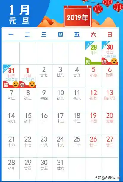 元旦:2018年12月30日至2019年1月1日放假调休,共3天。2018年12月29日(星期六)上班。