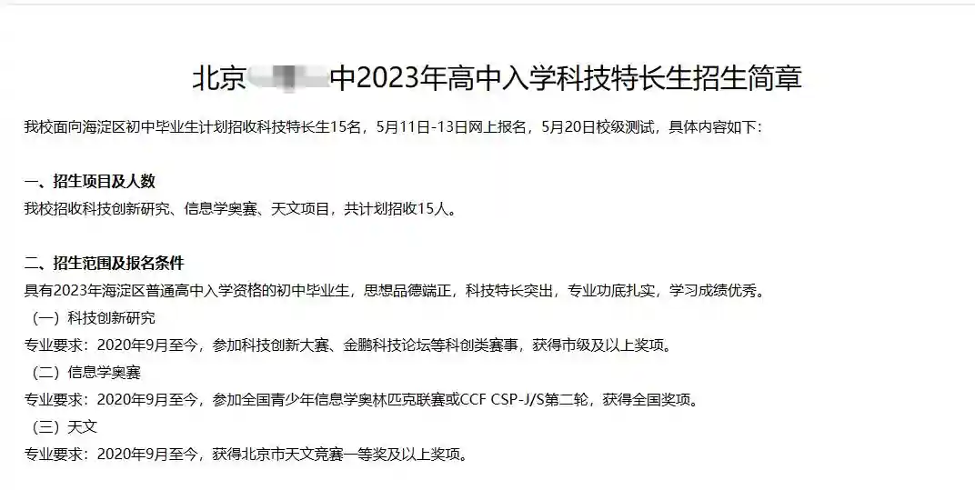 成都某公立K12学校的校长在此前采访中指出,有些高中有科创特长班,会相应考核学生,“但绝不会以某一科创竞赛的奖项作为必要条件”。在北京某高中的招生简章中,科技特长生的中考成绩占总体的60%。