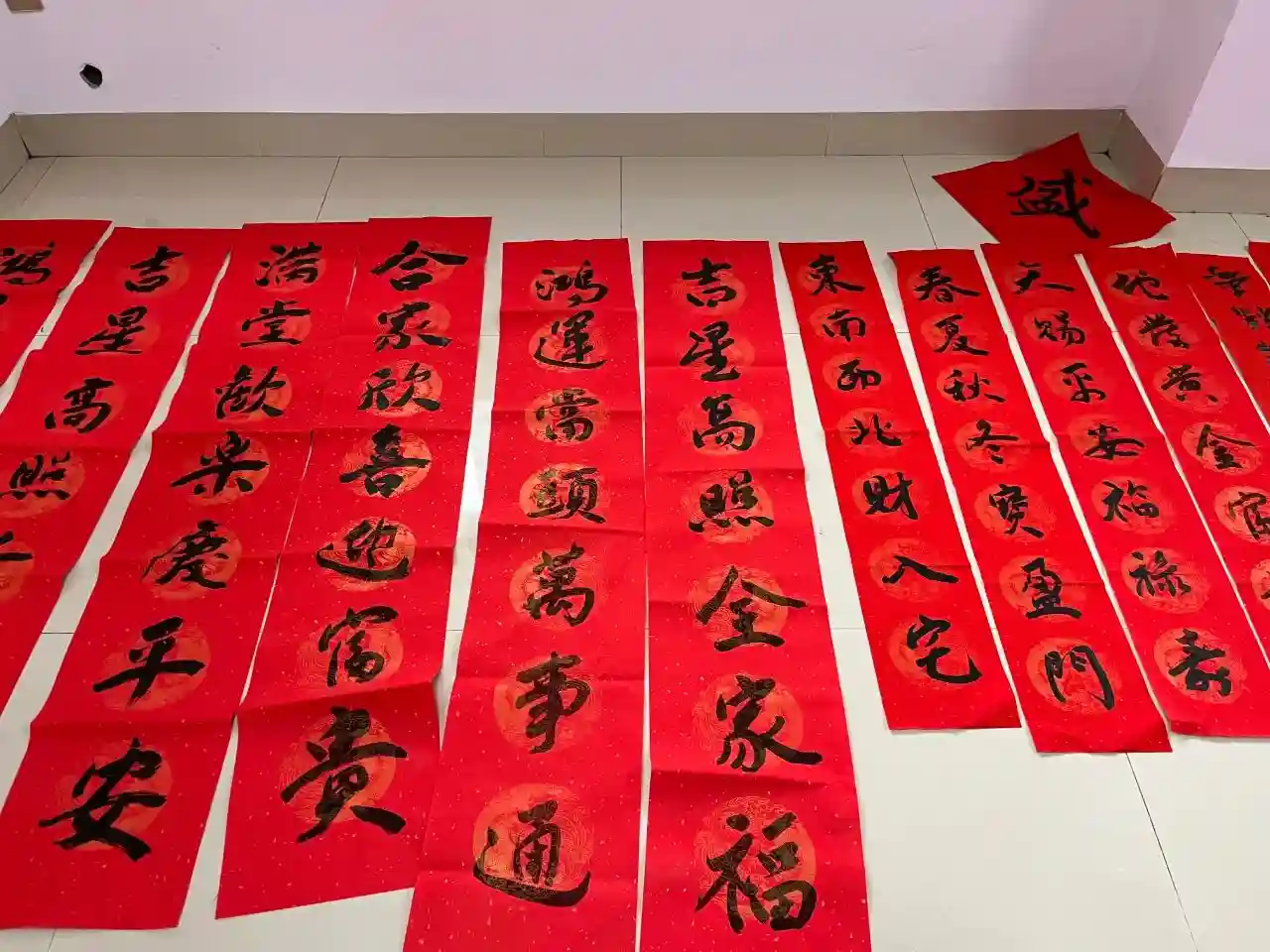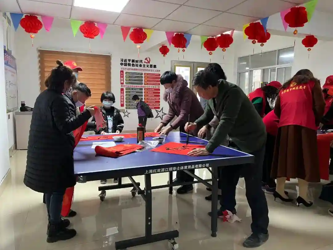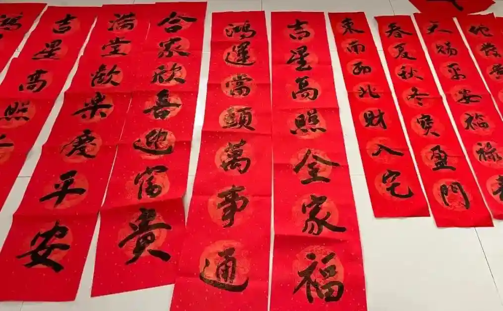 爱心慰问活动开始前,现场邀请到几位枫亭本土书法家薛奋飞、黄新贤、朱文洪等前来义写春联。他们泼墨挥毫,一副副新春祝福春联铺满地上,红红火火,十分喜庆,供村民自行挑选喜爱的春联。