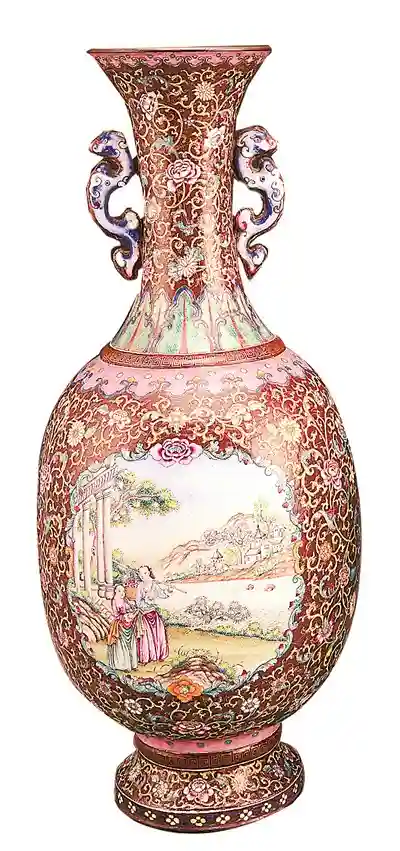 清代广州画珐琅缠枝花卉山水人物纹双耳瓶