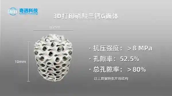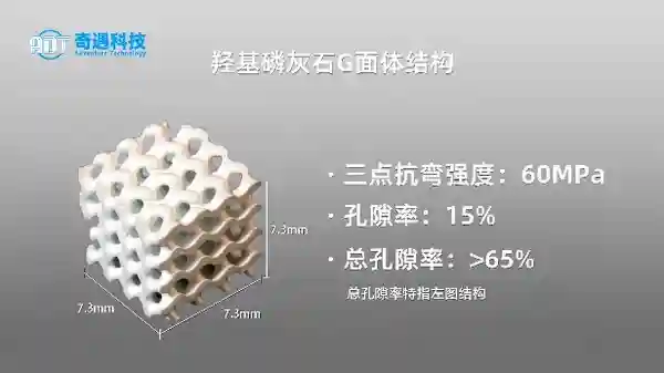羟基磷灰石(HAP)和磷酸三钙(TCP)是骨修复材料中最为常用的两种生物陶瓷。奇遇科技开发的3D打印材料在保持优良生物相容性的基础上,还具备优秀的机械强度。通过3D打印技术的加持,可精确控制样品的设计结构,根据需求灵活调整并快速验证。