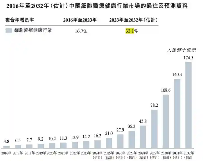 随着患有慢性疾病的老龄化人口不断增加和支持细胞研究政策的出台,细胞医疗健康行业规模不断扩张。灼识咨询资料显示,2023年中国细胞医疗健康行业的市场规模为人民币142亿元,预计到2032年增长到人民币1,745亿元,2023年至2032年的复合年增长率为32.1%。