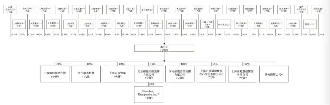 通过上海细胞股权架构图发现,公司执行董事、董事长兼总经理钱其军博士为上海细胞最大单一股东,透过白泽生物科技、湖州白泽、上海柏寰、上海昱寰、嘉兴乘黄、上海吉量、上海挚寰及上海萧稍持有的股份,行使公司约26.43%的表决权。