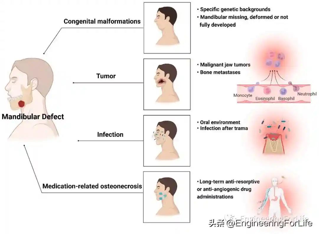 先天畸形、肿瘤、创伤、炎症和药物相关骨坏死等都会导致下颌骨缺损(图1)。例如恶性肿瘤、放射性骨坏死和药物/双磷酸盐(BPs)相关的颌骨骨坏死(MRONJ/BRONJ)是近年来下颌骨缺损的主要原因。在MRONJ晚期,节段切除是去除坏死骨的唯一方法,导致术后缺损。