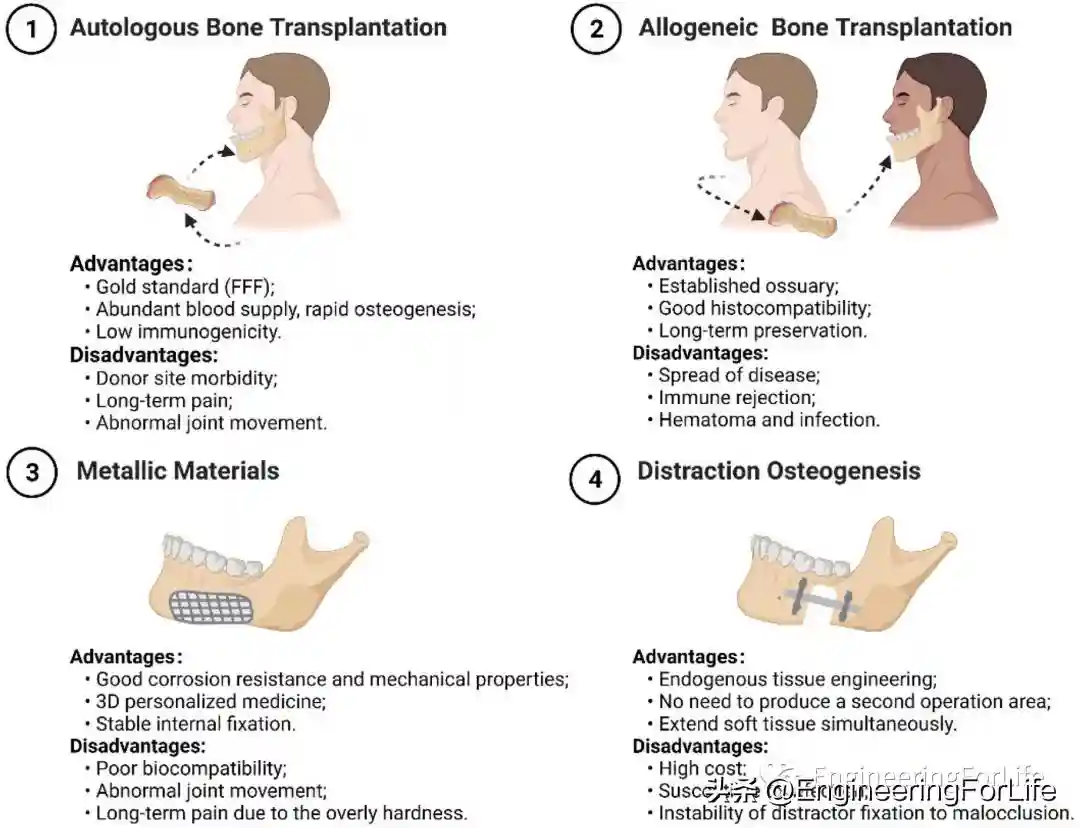 目前,在临床治疗中,骨移植、金属装置和牵张成骨已被用于填充或修复下颌骨缺损。其中,腓骨游离皮瓣(FFF)移植是下颌骨重建的金标准。但是考虑到存在细菌感染的发病率在7%至13%之间,临床治疗受到限制。下颌骨牵张成骨后,牵张装置相关感染风险为12.2%,患者有痛觉过敏和神经麻痹。此外,使用金属装置和牵引器进行下颌骨固定和再生不可避免地涉及多个侵入性手术和广泛的术前建模,从而增加了重复手术、生物相容性差以及不美观等缺点(图2)。