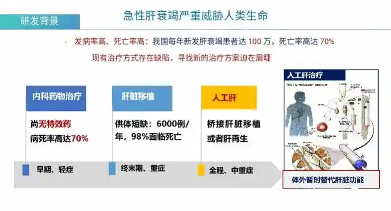 肝移植虽然是肝衰竭最有效治疗方案,但存在供体短缺、费用昂贵、手术难度大等临床痛点。据了解,我国每年仅有6000例左右肝衰竭患者能接受肝移植手术。