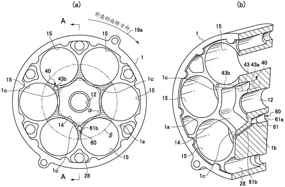 1a、曲柄室侧的端面,1b、阀板侧的端面,28、螺栓孔,61a-61b、第二抽气通路用轴孔-斜孔。