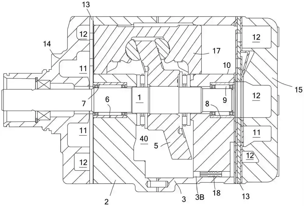 11、排气腔,12、吸气腔,13、阀板部件,14-15、前-后缸盖,17、活塞,3B、长孔,18、节流管。