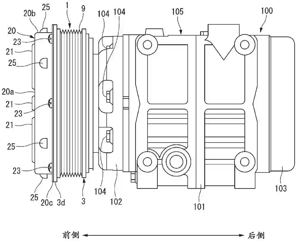 当电磁离合器暴露于水时,水会进入用于使转子平滑旋转的轴承,从而轴承的内部可能生锈。另一方面,在电磁离合器中,因为转子和电枢板彼此摩擦接合,所以从转子和电枢板的摩擦表面产生磨损粉末。为了防止磨损粉末在电磁离合器中积聚而引起与离合器的操作有关的问题,需要提供一种用于在电磁离合器的电枢板的整个前侧端部表面被盖件覆盖时将磨损粉末从电磁离合器的内部排出至外部的配置。