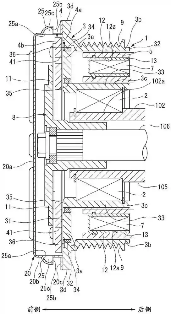 102a、圆柱形部分,106、驱动轴,1、电磁离合器,2、轴承,3、转子,4、电枢板,7、励磁线圈,8、毂。