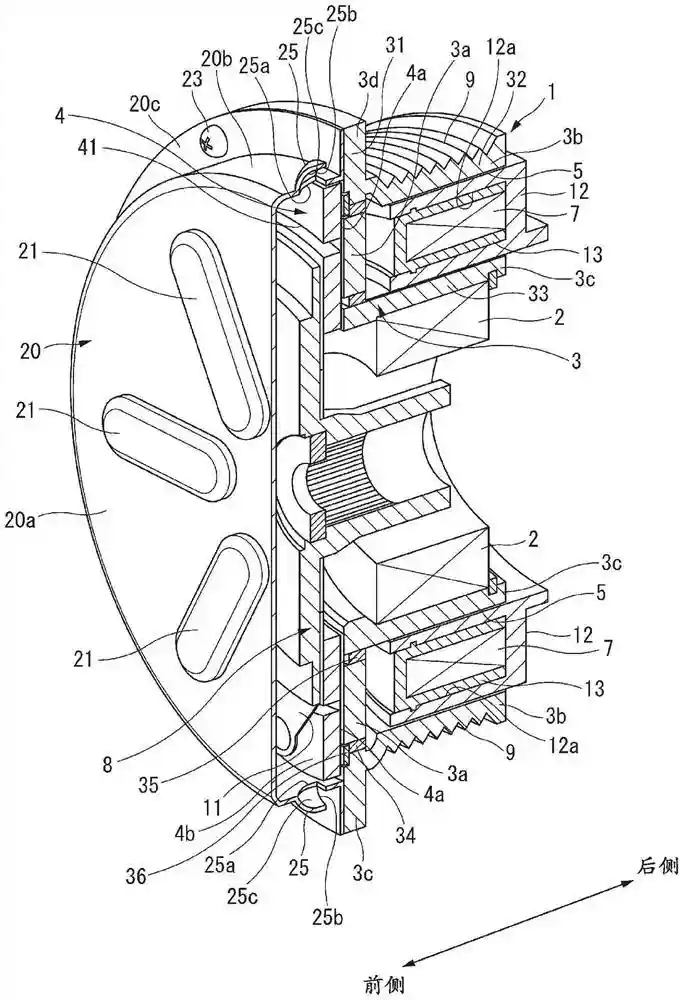 附接至转子的盖件上包括顶表面部分、圆柱形部分以及凸缘,顶表面部分的内周边表面面向电枢板的侧端部表面和毂的侧端部表面,圆柱形部分从顶表面部分的周边边缘朝向后侧延伸。凸缘在延伸方向上从圆柱形部分的端部向外突出,并且盖件覆盖电枢板的整个前侧端部表面和侧周边表面。在盖件的顶表面部分的内表面与电枢板的侧端部表面和毂的侧端部表面之间,以及在盖件的圆柱形部分的内周边表面与电枢板的外周边表面之间形成具有预定宽度的间隔,以免使盖件在盖件与转子同步旋转时与电枢板和毂接触。