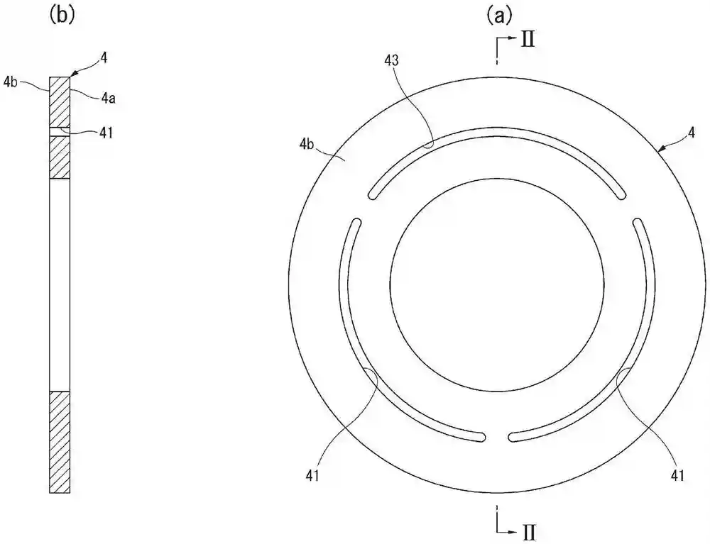 4、电枢板,4a、后侧端部表面,4b、前侧端部表面,41、弧形狭缝孔,9、带槽。