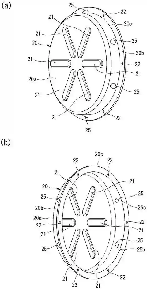 20、盖件,20a、顶表面部分,20b、圆柱形部分,20c、凸缘,21、凸出部分,22、通孔,25、异物排出部分。