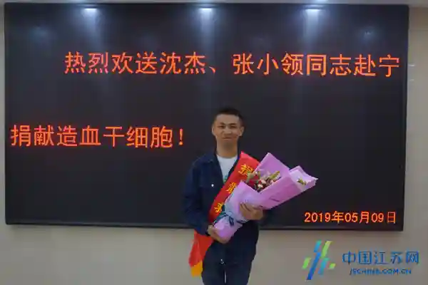 中国江苏网5月10日无锡讯2019年5月9日,无锡市红十字会携手惠山区红十字会、惠山区玉祁街道和前洲街道共同为我市第52位造血干细胞捐献志愿者沈杰同志和第53位造血干细胞捐献志愿者张小领同志赴宁捐献造血干细胞举行欢送会。他们也分别是惠山区第8位和第9位造血干细胞捐献志愿者。
