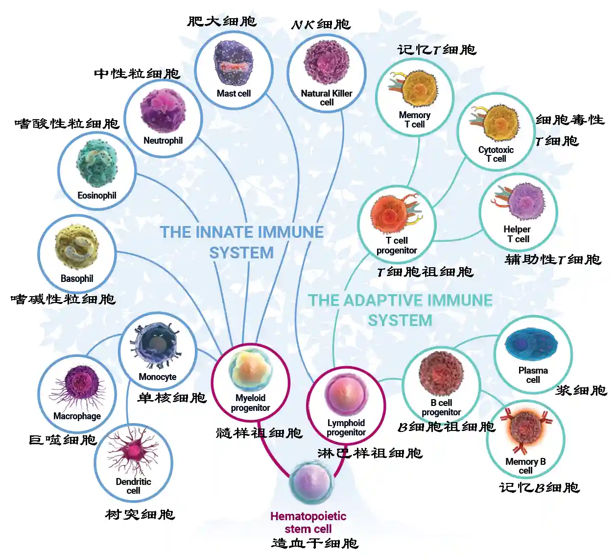 但是,免疫细胞们都来自于一个始祖:造血干细胞。