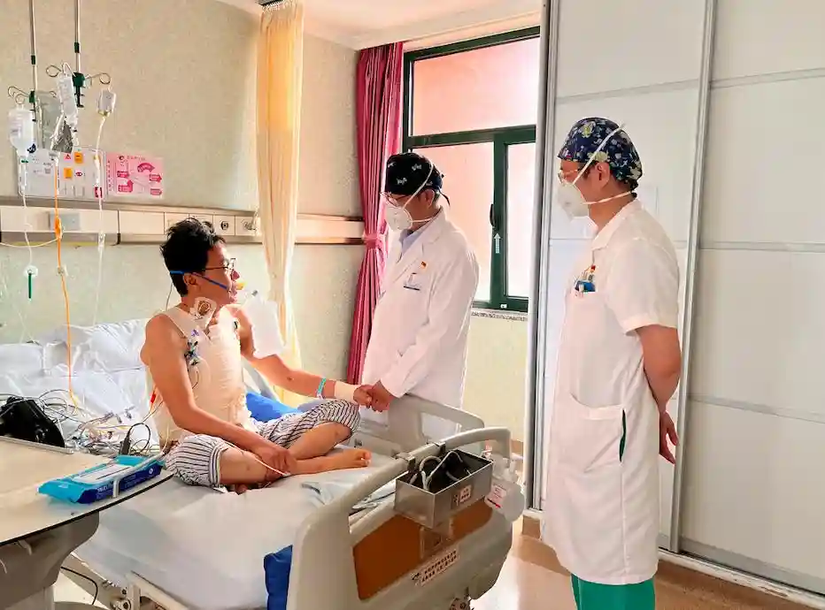 北京安贞医院张宏家院长亲自上台为张先生进行全国首例获NMPA批准的全磁悬浮式“人工心脏”植入术,术后第二天,北京安贞医院院长张宏家和心肺移植中心副主任贡鸣前往查房。