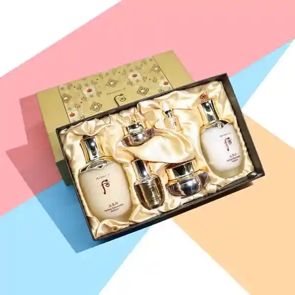 这是Whoo家的明星套盒,被称为全能套盒,属于调理型的套盒。提拉紧致,再生细胞,高效修复,修复保养,改善肌肤暗沉深层补水、去黄气、抗皱、美白很全面的一套,能从根本上解决肌肤的水油问题。