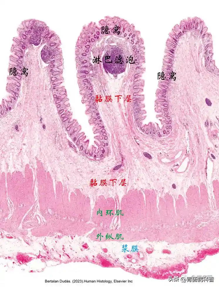 盲肠黏膜被覆上皮由柱状吸收细胞及杯状细胞构成。盲肠黏膜与黏膜下层常含有淋巴滤泡,黏膜延伸入固有层形成Lieberkühn隐窝,位于黏膜肌层下方的隐窝底部具有嗜酸性颗粒的潘氏细胞。
