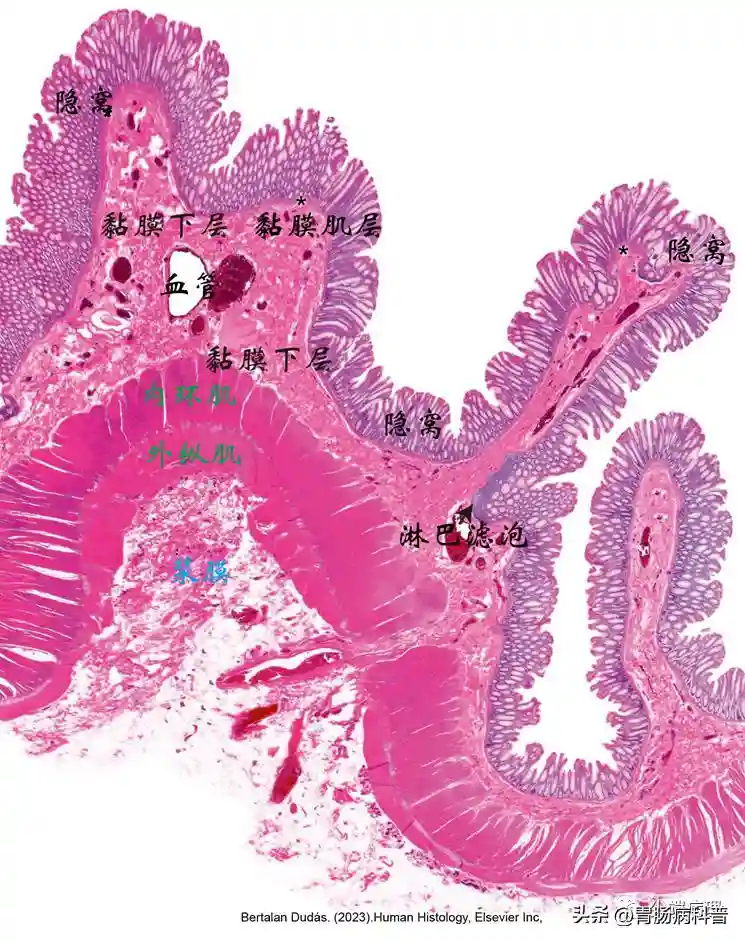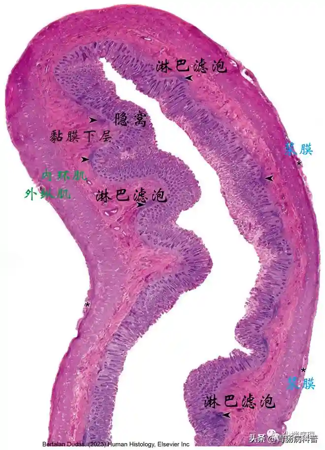 上皮延伸入Lieberkühn隐窝,这些隐窝深达黏膜固有层垂直于黏膜肌层,呈“试管架样”外观。隐窝内含有大量杯状细胞,黏膜固有层含有淋巴滤泡。