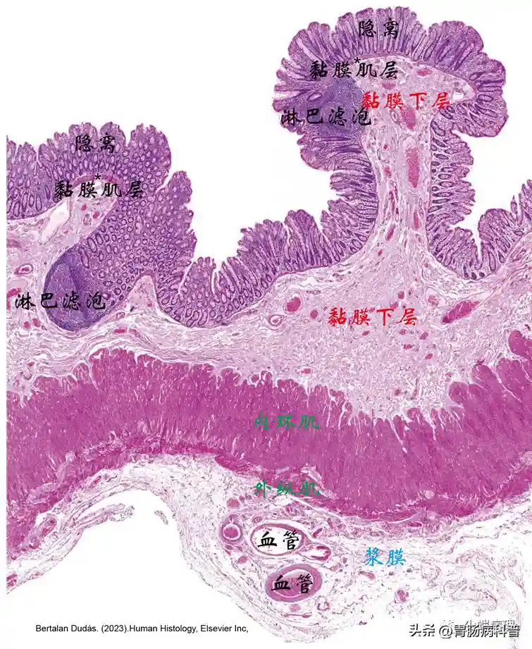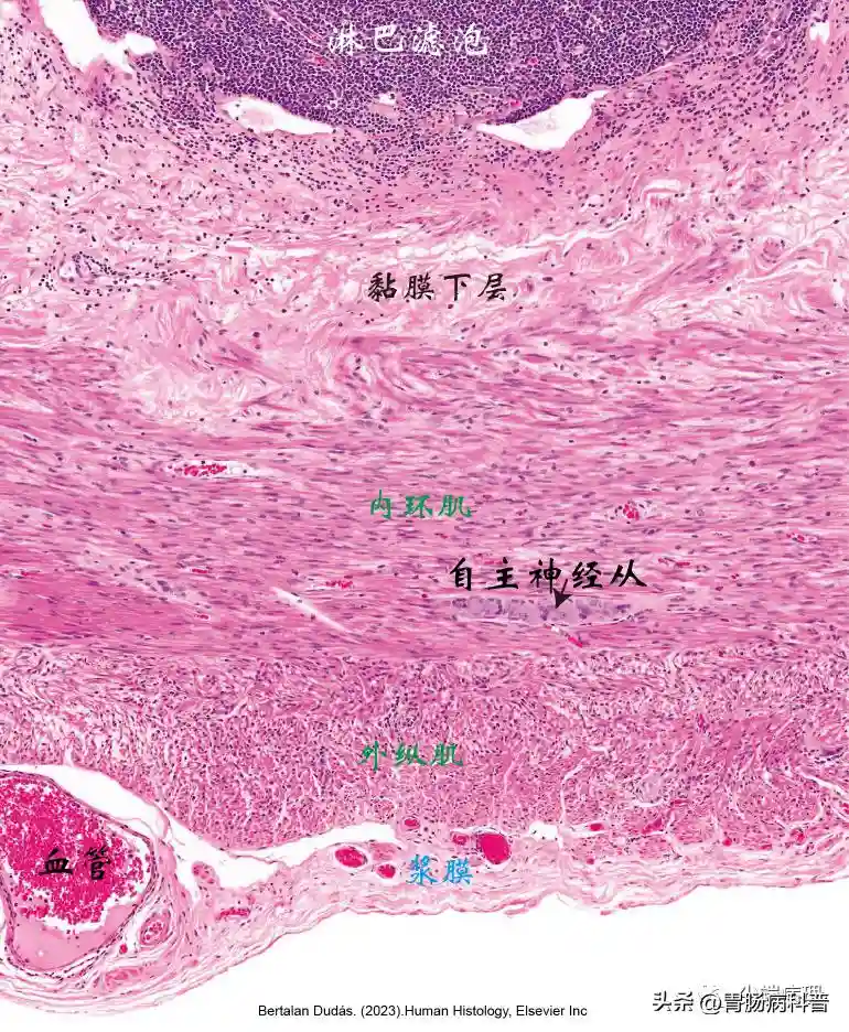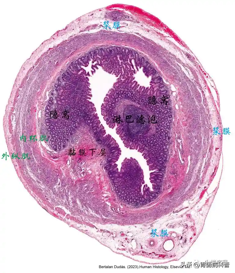 阑尾黏膜上皮由柱状细胞以及杯状细胞组成,它们延伸入Lieberkühn隐窝,此处杯状细胞数量较多。黏膜固有层含有大量Lieberkühn隐窝大量的嗜酸性粒细胞。黏膜肌层下方为黏膜下层。内环肌和外纵肌之间有肌间自主神经丛,浆膜有血管、神经及间皮覆盖。