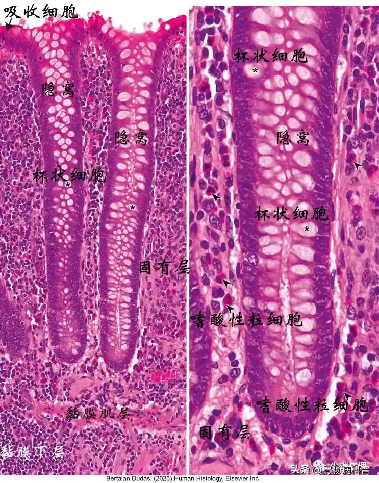 右半结肠的结肠细胞/杯状细胞数约为5:1,该比值在左半结肠为3-4:1。Paneth细胞在右半结肠隐窝底部可见,远端1/3横结肠后出现,则提示出现慢性黏膜损伤的化生。而且右半结肠的上皮内淋巴细胞密度高于左半结肠。