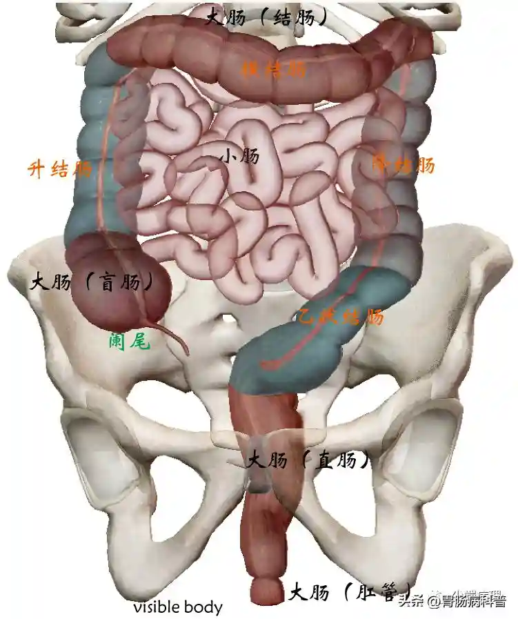 结肠是胃肠道的末段,下端移行为直肠,全长约1-1.5米。结肠特有的结肠带和结肠袋的结构。