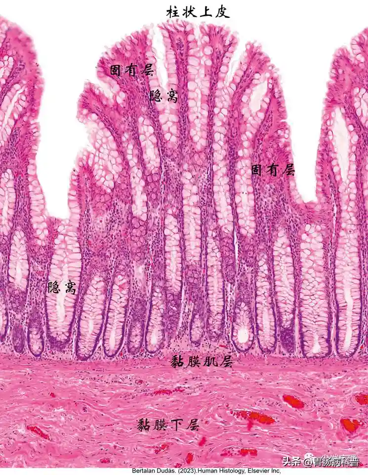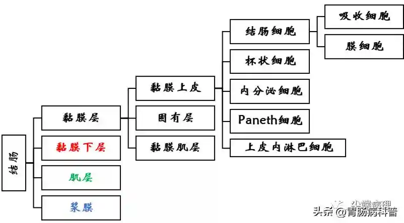 结肠分为:黏膜层、黏膜下层、肌层和浆膜。其中黏膜上皮由柱状上皮被覆,柱状上皮内衬于隐窝内,这些隐窝深达黏膜固有层垂直于黏膜肌层,呈“试管架样”外观。表面上皮由结肠细胞(吸收细胞、M细胞)和杯状细胞等组成。