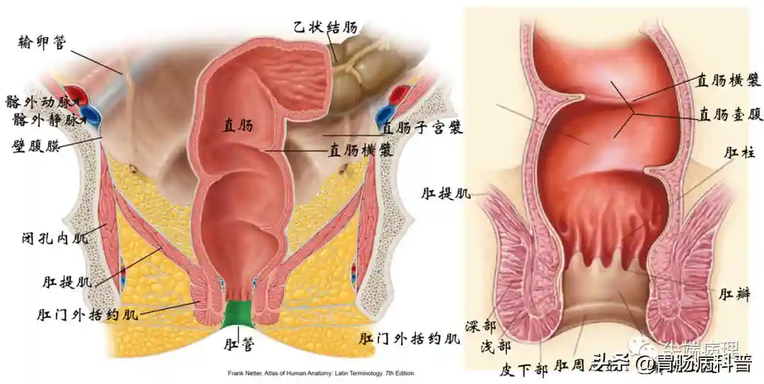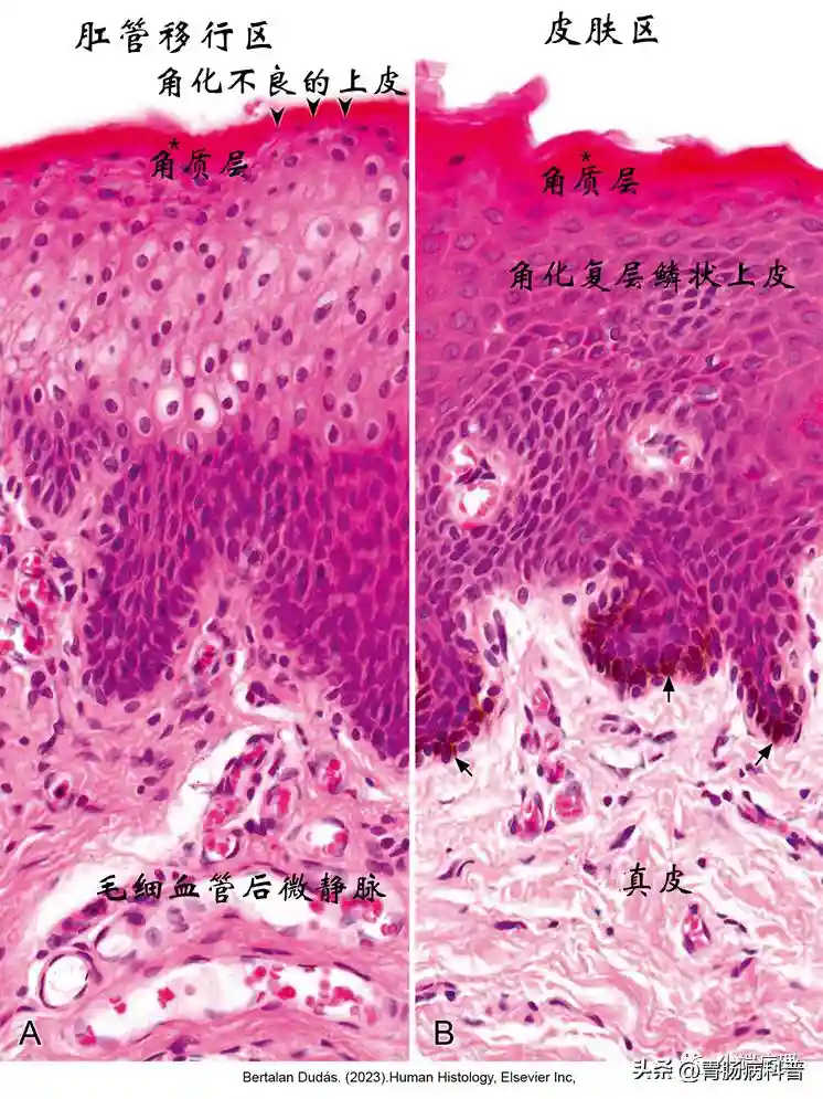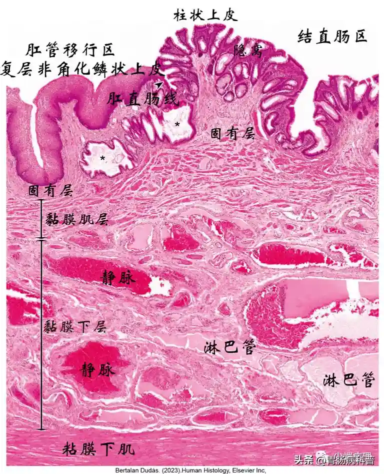肛管分为近端的结直肠区,肛管移行区,皮肤(鳞状上皮)区。结直肠区被覆柱状上皮。肛门直肠线是结直肠区和肛管移行区交界,从柱状上皮突变为复层立方上皮,然后转变为复层非角化或角化不全鳞状上皮,排列于肛门移行区。