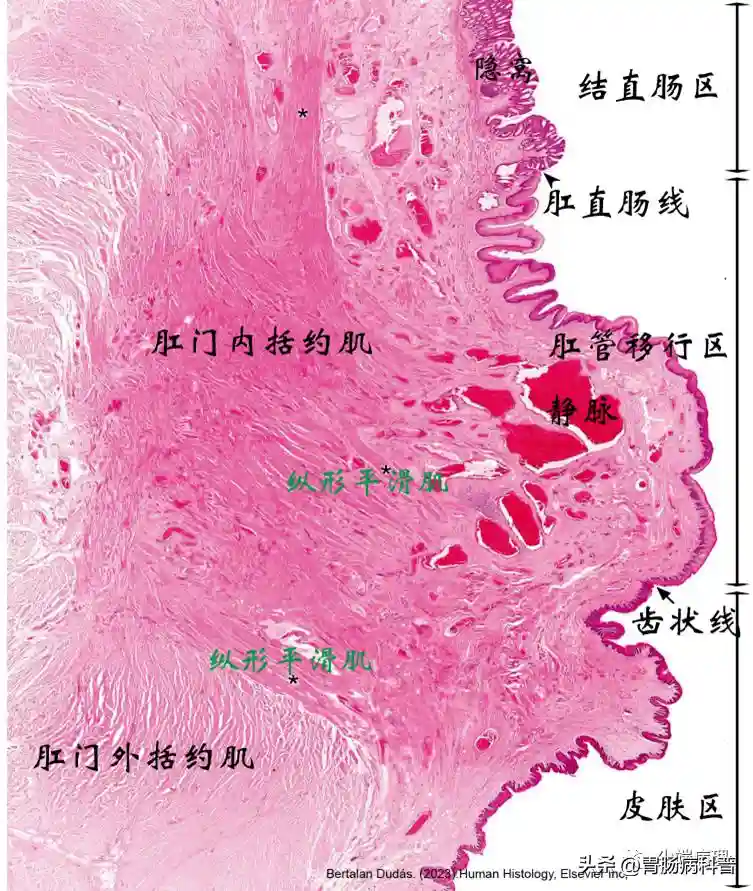 皮肤区和移行区以齿状线为界限。肛门移行区含有内痔静脉丛的静脉。纵行平滑肌层穿透并包绕肛门内括约肌。
