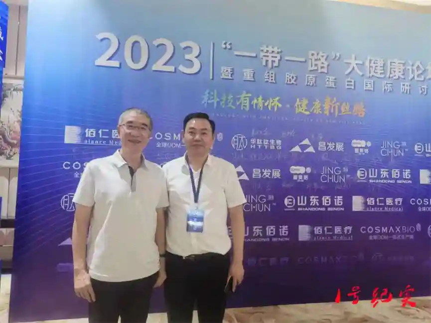 2023年8月21-22日,以“科技有情怀,健康新丝路”为主题的“一带一路”大健康论坛暨重组胶原蛋白国际研讨会在北京朗丽兹西山花园酒店成功举行。国内外的30余位专家在营养干预、慢性疾病防控、皮肤健康与管理、胶原蛋白关键原材料创新等方面进行了精彩分享。易少啟应邀参加盛会,他还与北京大学教授、博士生导师、国务院特殊津贴获得者李勇,就肽营养学等进行现场交流并合影留念。