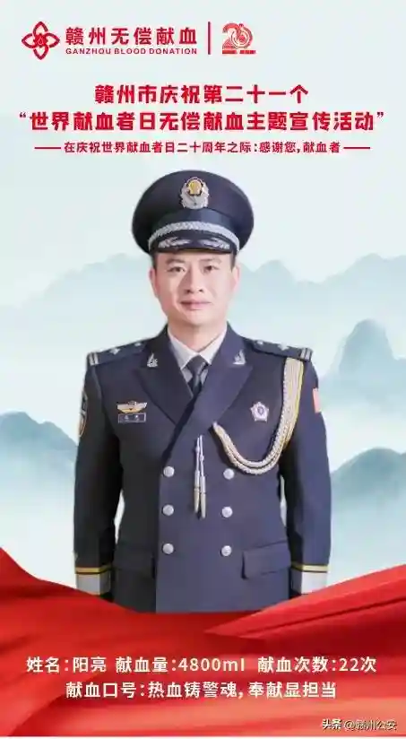 自2001年6月大学毕业以来,他扎根基层,兢兢业业,在做好本职工作的同时,连续坚持无偿献血23年,累计献血10500毫升,先后荣获无偿献血铜奖、银奖、金奖,用实际行动彰显了公安民警强烈的责任担当,更充分展示了新时代人民公安为人民的良好形象。