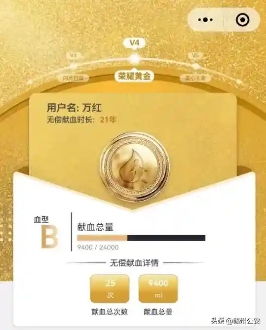 无偿献血21年,献血次数达71次,献血总量26600ml。曾荣获“2020——2021年度全国无偿献血金奖”荣誉称号。