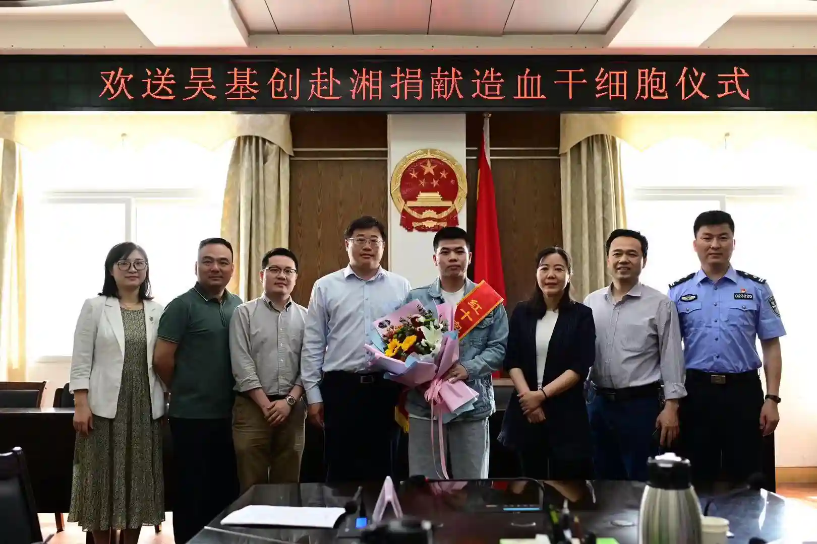 (九江报业融媒记者金璐文/摄)“我们能匹配成功,是一种特别的缘分,希望帮助患者早日康复。”5月6日,在柴桑区政府会议室举行了一场简单的欢送仪式,九江市柴桑区公安局沙河派出所辅警吴基创前往湖南进行造血干细胞捐赠,挽救一名素不相识的生命。