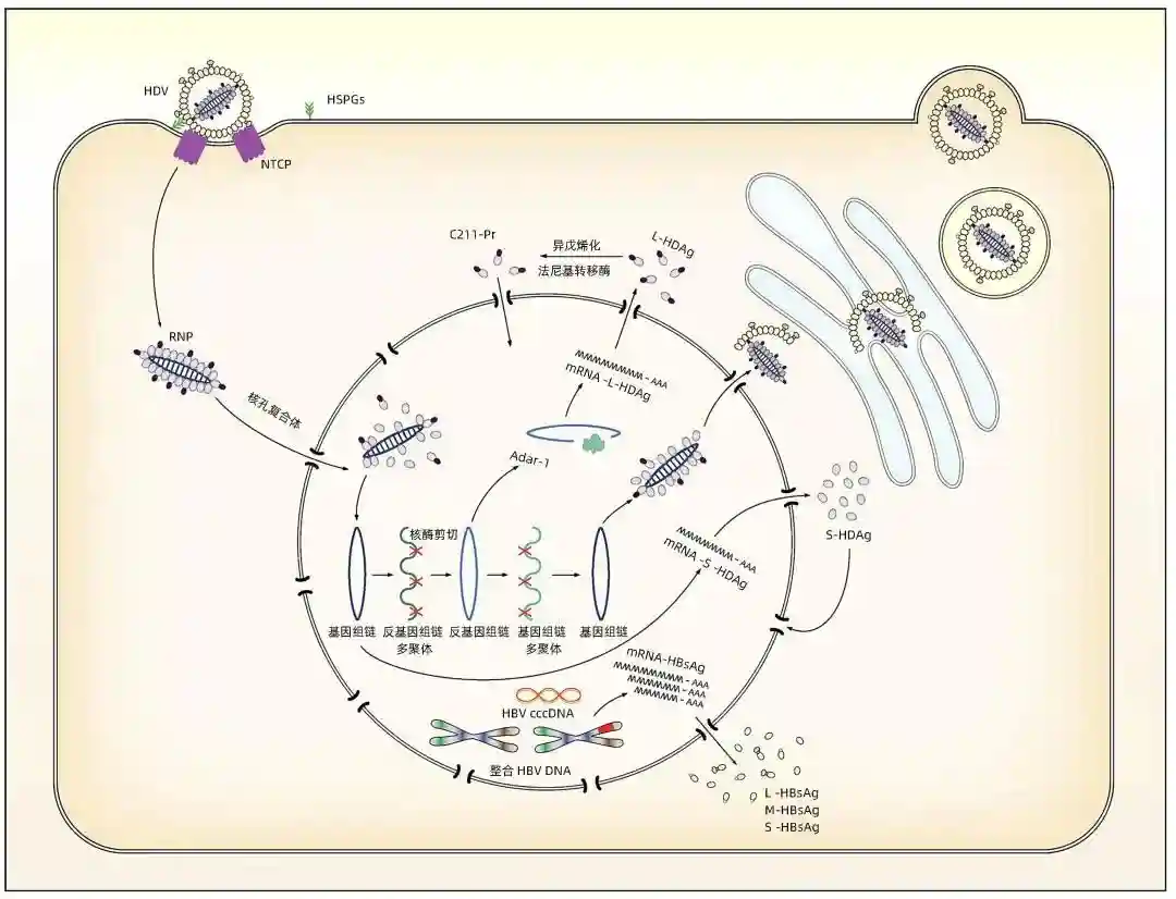 注:HSPGs,硫酸乙酰肝素蛋白多糖;RNP,核糖蛋白;Adar-1,核糖核酸特异性腺苷脱氧酶;L-HDAg,大-丁型肝炎抗原;S-HDAg,小-丁型肝炎抗原;L-HBsAg,大-乙型肝炎抗原;M-HBsAg,中-乙型肝炎抗原;S-HBsAg,小-乙型肝炎抗原。