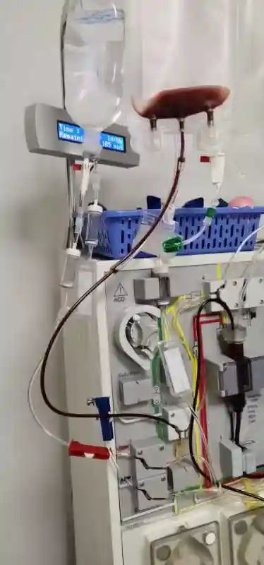 3月27日6时30分,护理团队核心成员邓柯、陈婷婷调试好血细胞分离机,完成洪先生外周血细胞检测及静脉采集干细胞置管。7时始,采集洪先生造血干细胞,分离机飞速运转,采集过程非常顺利,全程无卡顿。11时50分,顺利完成采集造血干细胞。
