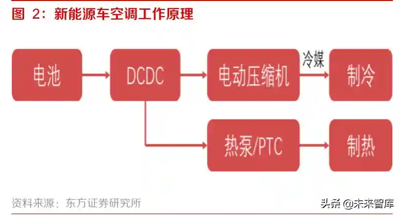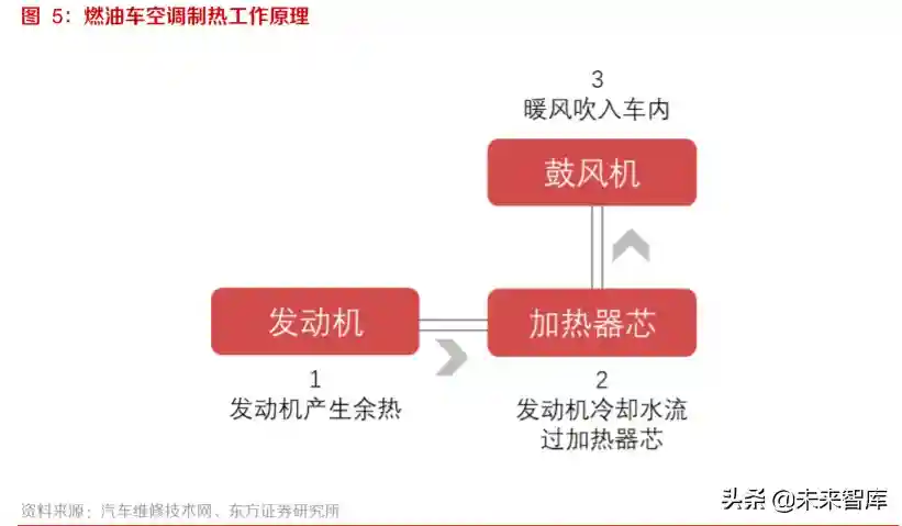 (3)制热原理不同,新能源车热泵空调制热模式下,电池带动电动压缩机对制冷剂进行处理,通过车内换热器与制冷剂进行热量交换,实现车内供热。新能源车PTC空调制热模型下,电动水泵将循环水推入PTC进行加热,高温水通过暖风芯体将热量传递给空气,实现供热。燃油车空调发动机通过将余热传递给冷却水,通过加热器芯将热量传递给空气,最后鼓风机将暖风吹入车内。