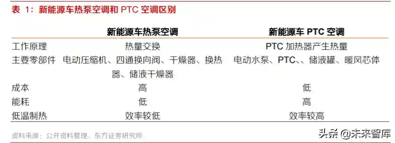 热泵空调是未来新能源车空调系统的发展趋势。热泵空调与PTC空调相比差别主要体现在:工作原理不同,主要零部件构成不同,成本不同,能耗不同,低温制热效率不同等。