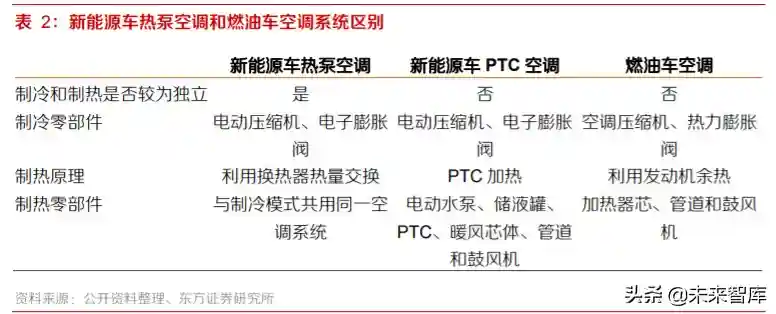 从制冷模式看,新能源车空调电动压缩机和电子膨胀阀替代燃油车空调压缩机和热力膨胀阀。从制热模式看,新能源车空调分为热泵和PTC两种技术路线,分别利用热量交换和电力转换为热量实现供热,而燃油车空调利用发动机余热实现供热。具体区别如下: