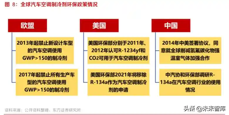 对汽车环保要求的提升是推动汽车空调制冷剂的技术路线持续演进的主要原因。在环保政策较为严格的欧盟,在2013年和2017年将分别禁止在新设计车型和生产车型的汽车空调中使用GWP(温室效应)150的制冷剂。美国环保部则分别于2011年和2012年认可R-1234yf和CO2可用于汽车空调制冷剂,同时推动在2021年开始禁止R-134a作为汽车空调条制冷剂。中国也逐步推进汽车空调制冷剂的升级,2014年与美国签署协议就削减氢氟碳化物强温室气体加强合作;中汽协和环保已经在考察R-134a在汽车空调行业的使用情况。
