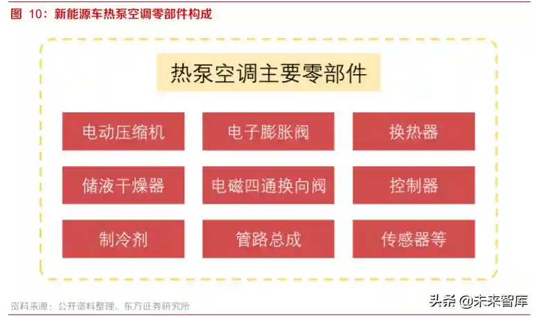 3、热泵空调核心零部件竞争格局新能源车热泵空调零部件众多,新能源车热泵空调主要由电动压缩机、电子膨胀阀、四通换向阀、换热器(蒸发器或冷凝器)、管路总成、储液器、控制器、鼓风机等其他零部件构成。其中,电动压缩机、电子膨胀阀和电磁四通换向阀、换热器、管路总成是热泵空调的核心零部件。